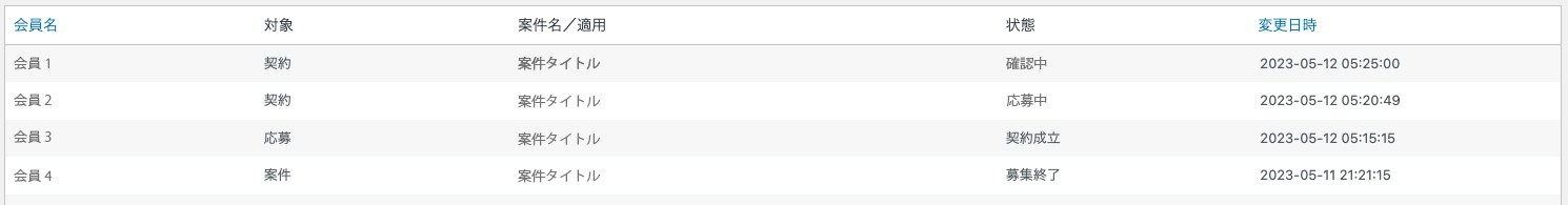 会員名、対象、案件名/適用、状態、変更日時を確認できます。