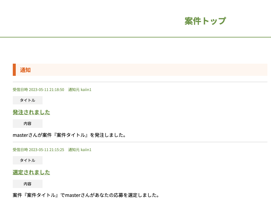 【利用規約に同意して発注する】をクリックすると発注され、応募者には下図のように通知されます。