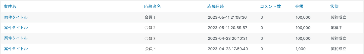 案件名、応募者名、応募日時、コメント数、金額、状態を確認できます。