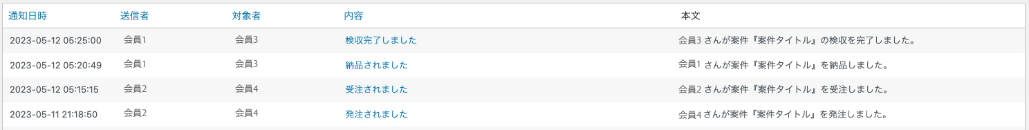 運営管理画面から【通知一覧】をクリックすると通知の一覧ページが表示されます。