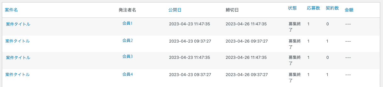 運営管理画面から【案件一覧】をクリックすると案件の一覧ページが表示されます。案件名、発注者名、公開日、締切日、状態、応募数、契約数、金額を確認できます。